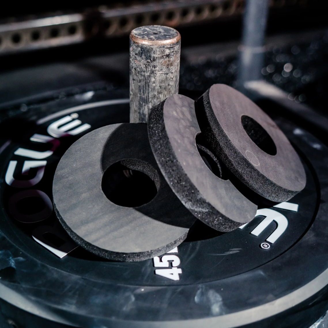 AbMat’s Sled Spacers allow you to easily and efficiently add and remove plates from your sled. The circular foam discs slide on between plates to create a small gap just wide enough to easily remove the plates when you’re done with your workout, eliminating the need to try and pry the plates apart. They also reduce damage to the plates—especially metal ones that are prone to chipping due to blunt impact—by providing a cushioned barrier when you drop a new plate on. An added benefit is that sled spacers effectively reduce unwanted sound.