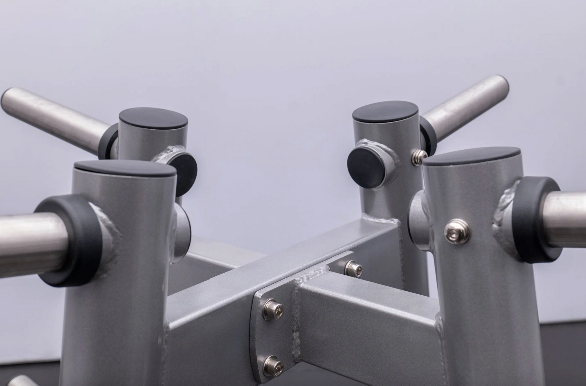 The CF2134 Weight Plate Tree tree has 12 plate pegs that hold up to 10 plates on each peg. The rack is commercial grade with a sleek futuristic design and can hold over 1000 lbs .