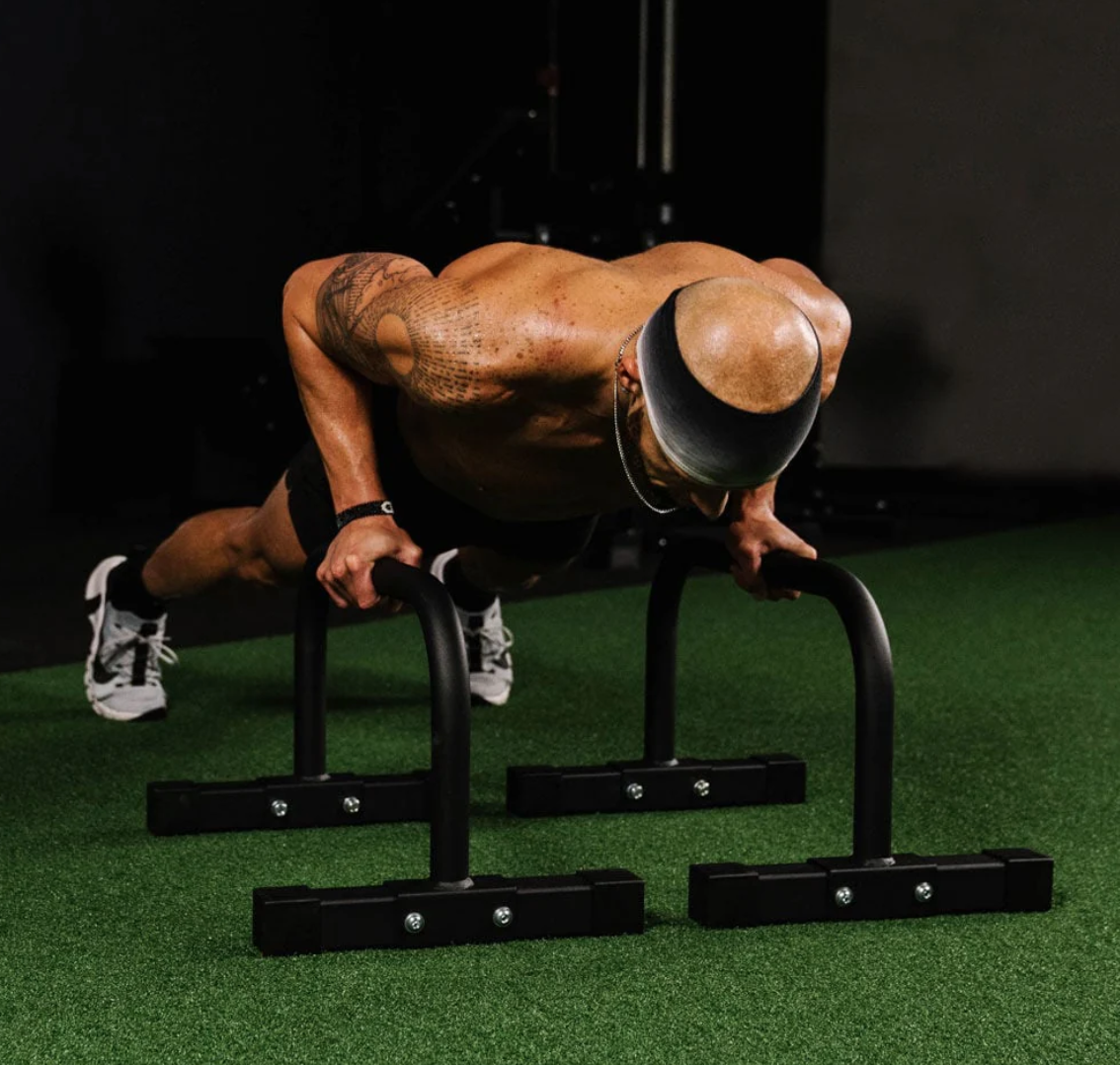 - Rubber feet grip the floor to prevent the parallettes from sliding