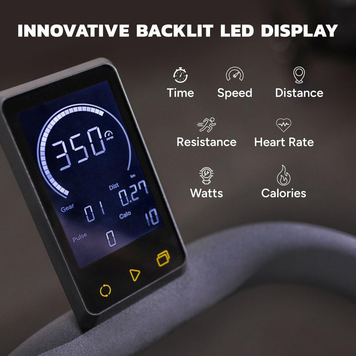 4.8” LED Shows: Resistance, Time, Distance, Heart Rate, Watts, Calories, Speed, Bluetooth Connection