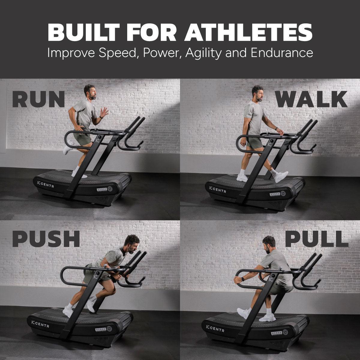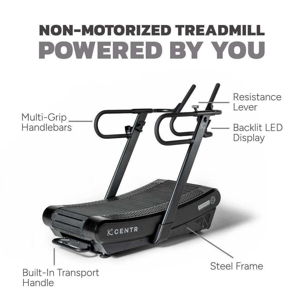The Centr x HYROX Perform Treadmill is a motorless running machine made for athletes and next-level performance. This motorless curved treadmill design encourages proper form, while the cushioned, shock-absorbing surface maximizes endurance and stamina so you can conquer your runs and sled-push simulations.