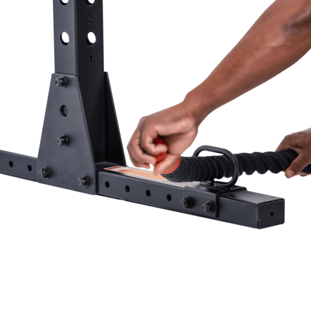A Full Power Cage with multi-grip pull up bar, adjustable inner and outer safeties, J-hooks, dip handles, landmine attachment, band attachments and battle rope holder.