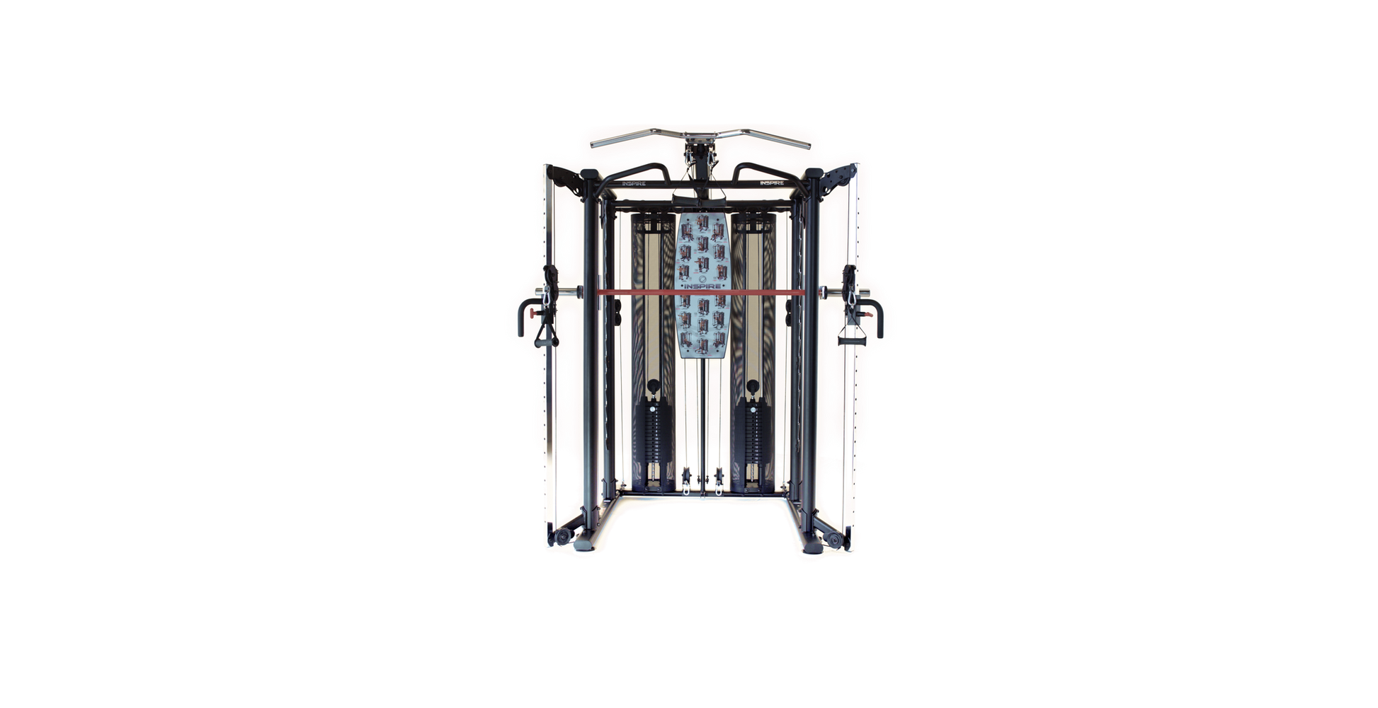 SMITH MACHINE FUNCTIONAL TRAINER: Equipped with 6 total pulleys, pull up bar, power rack, and free weight smith bar