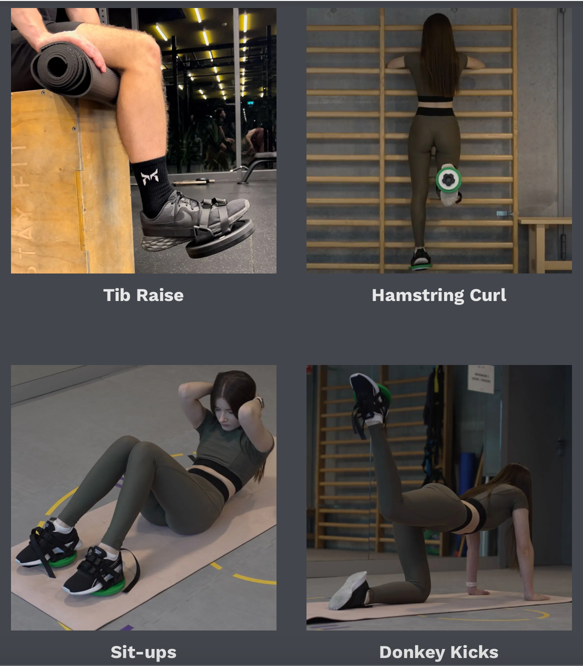 Perfect for hamstring curls, legs raises, knee extension, tib raises, donkey kicks, ab raises, mountain climbers, glute kickbacks, high knees, fire hydrants, sit-ups, pull-ups, V-splits, clam shells, side raises and many more exercises!