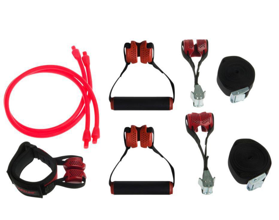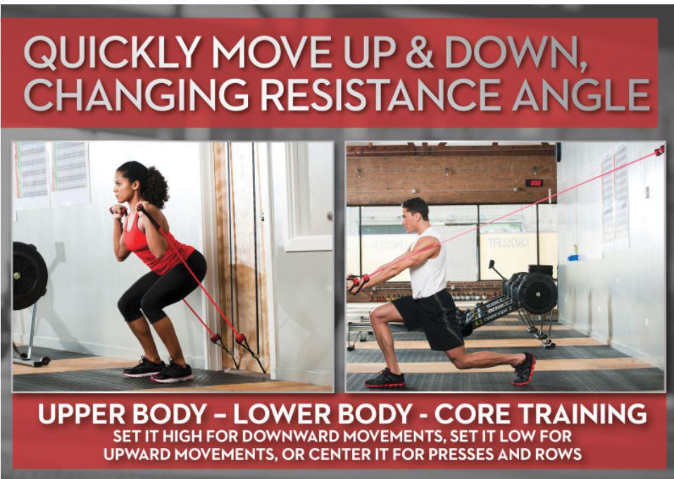 Two door straps with patented, secure two-way steel buckles safely and easily connect to doors for a total body resistance cable workout wherever you are or go. Interchangeable handles and adjustable anchor points allow for pushes, pulls, curls and presses from a variety of resistance levels, angles and planes to efficiently target specific muscles and create balanced strength for fewer injuries and more complete physical fitness and athletic performances.