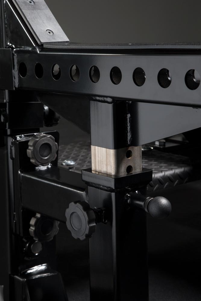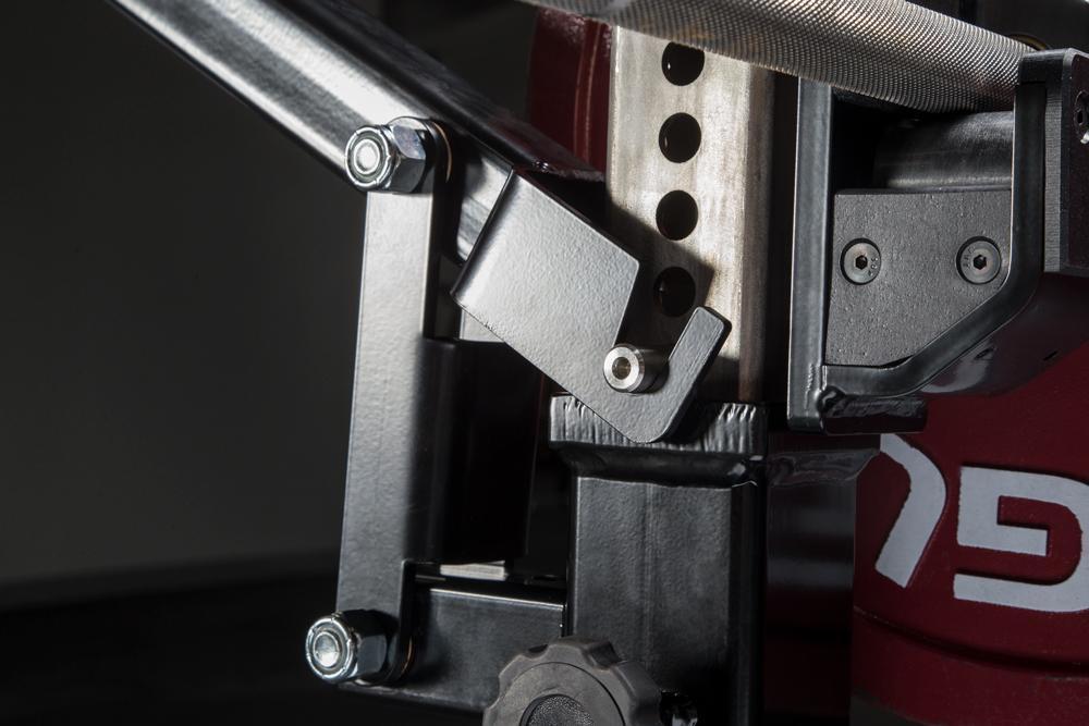 When you want to switch between athletes of different sizes, the height of the J-cups can be quickly adjusted using our unique jack system—with no need to waste time removing plates from your barbell. Simply use the lever arms to raise or lower the position, referring to the laser-cut numbers in the uprights for guidance. Both the jack handles and the telescoping tubes of the uprights are made from stainless steel, as are the (4) machined pins used to set the upright height. Storage for these pins is integrated into the jacks themselves.