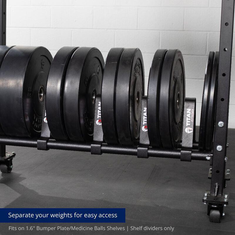 Organize your weights by adding Shelf Dividers to your Mass Storage System. Each divider is 2-inches wide and fits securely anywhere on your Bumper Plate/Medicine Balls shelf, allowing you to break up your weights for easy access. Available for the 42 and 70-inch Bumper Plate Shelves.