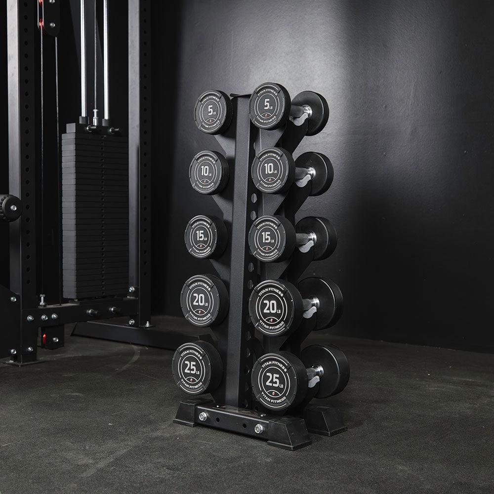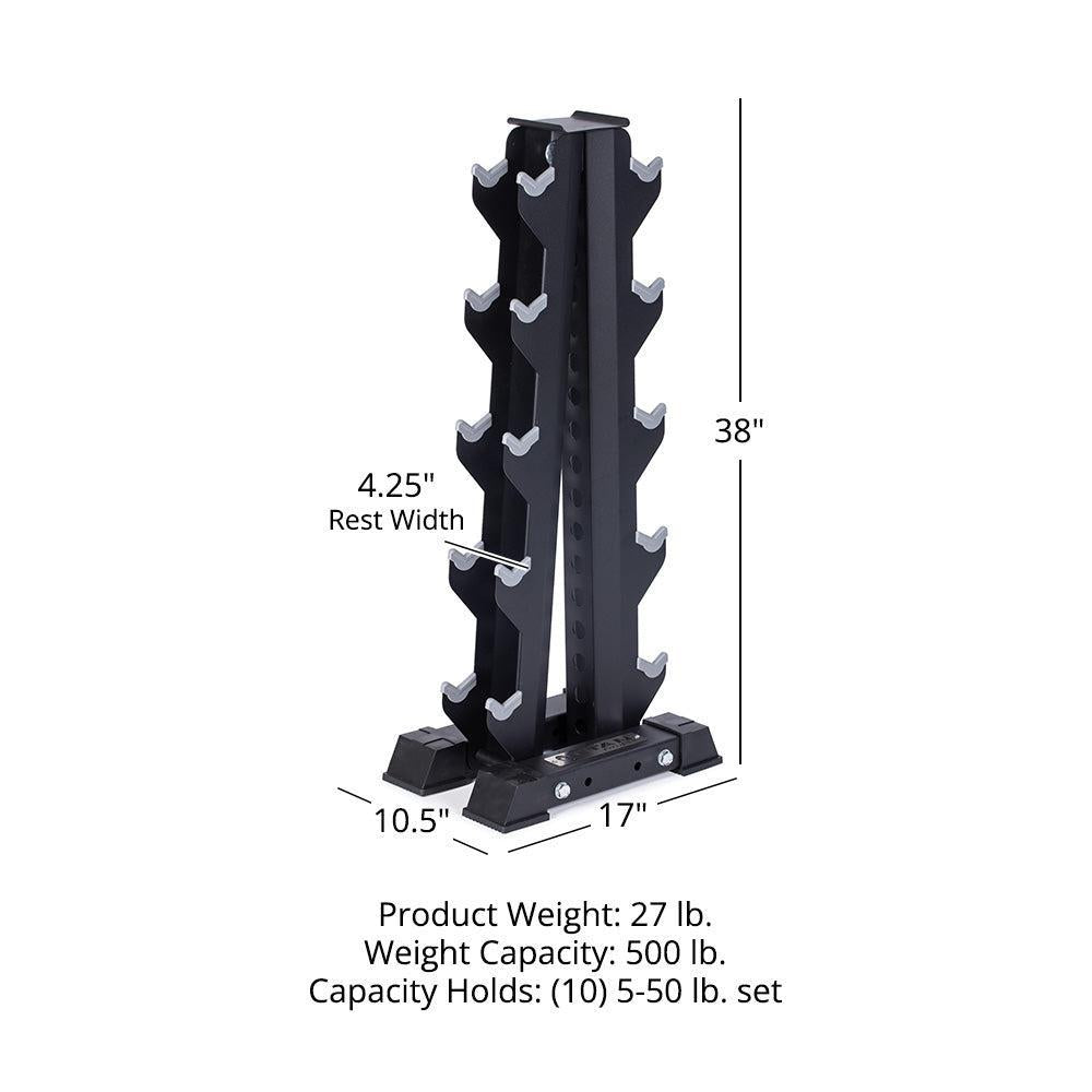 This heavy-duty dumbbell rack has a 500 LB total weight capacity and holds 5 pairs of dumbbells (sold separately) up to 50 LB each, keeping your gear organized and off the floor. Choose between a tower or A-frame, it can be customized to match your setup and maximize your training space. The ergonomic cradles have bumper edges for easy loading and unloading, without pinched fingers or sharp edges that could damage your dumbbells. Plus, the non-slip base grips the floor for serious stability. No wobble, no tipping - just solid support.