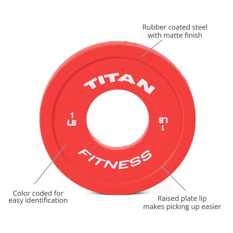 The Color-Coded Fractional Plates are offered in pairs of 0.25 LB (Green), 0.5 LB (Yellow), 0.75 LB (Blue), and 1 LB (Red), creating a complete set of 5-pounds. Each plate features a 50 mm collar opening and a durable rubber coating for a lasting hold on any standard Olympic barbell. The plates provide a matte finish with color-coded weight dimensions for easy identification during your workout and between sets. For those looking to get everything down to the last pound, these Fractional Plates are what you need to leave the old PR's in the dust!