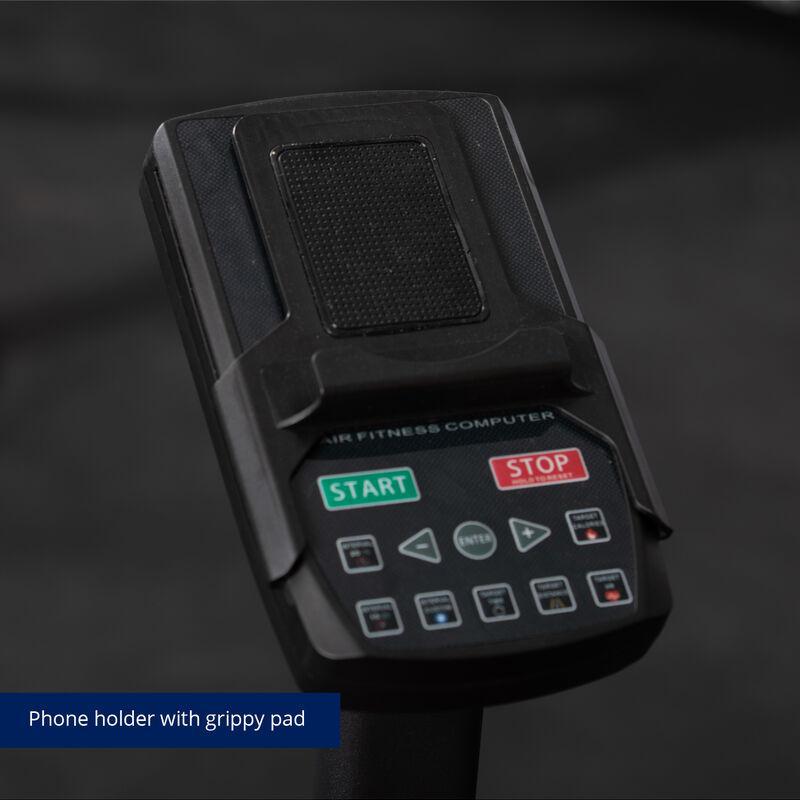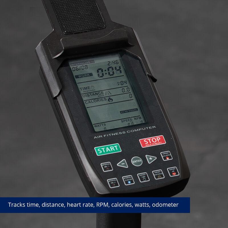 The Titan Fitness® Fan Bike is bigger and brawnier made with 111-pounds of heavy-gauge steel to help take your workout to the next level. This bike is integrated with sealed cartridge bearings in every pivot, reinforced pedals, and cranks, and is fashioned around a heavy-duty steel frame with a powder-coated finish. Additionally, the Fan Bike features a high contrast LCD console tailored to fit your specific goals. From endurance and stamina training to HIIT and Tabata — choose from a range of interval training programs for a total body workout. This Fan Bike’s compact design makes it easy to use anywhere and with durable 10-inch turf tires, moving this bike is easy across any terrain. Plus, it’s loaded with all the extras that come standard: fan guard, water bottle holder, phone holder, and a built-in back handle for easy maneuverability.
